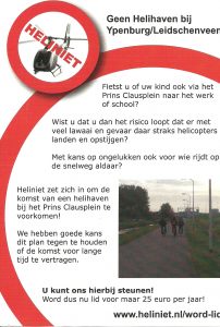 De flyer wijst op het risico voor mensen die via het Prins Clausplein naar hun werk fietsen. Ook kinderen die via deze route naar school fietsen lopen het risico dat daar met veel lawaai en gevaar straks helicopters landen en opstijgen. Bovendien bestaat kans op ongelukken voor wie daar op de snelweg rijdt.
